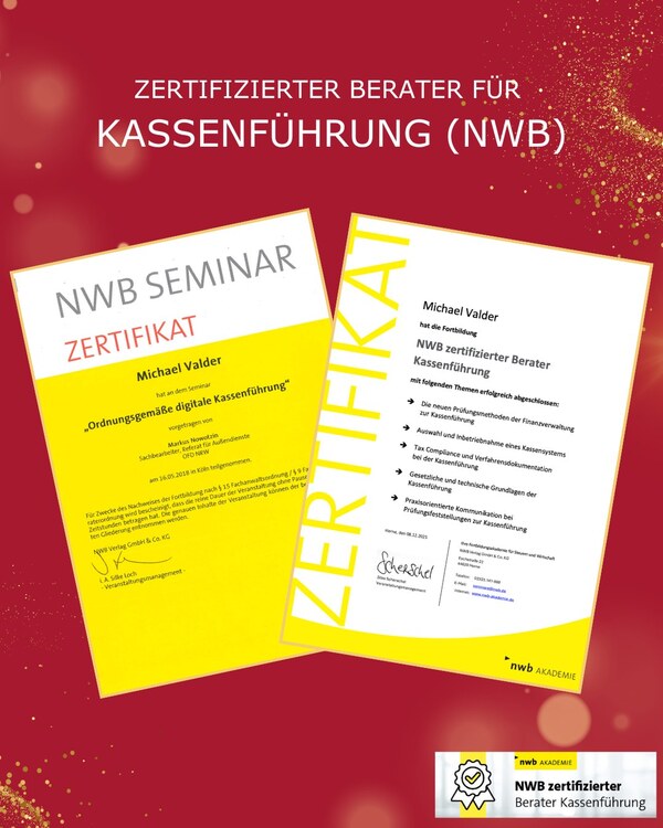 Um unser Beratungsniveau in diesem Bereich weiter zu stärken, hat unser Partner Michael Valder in 2025 erfolgreich die Fortbildung zum „Zertifizierten Berater Kassenführung (NWB)“ absolviert.